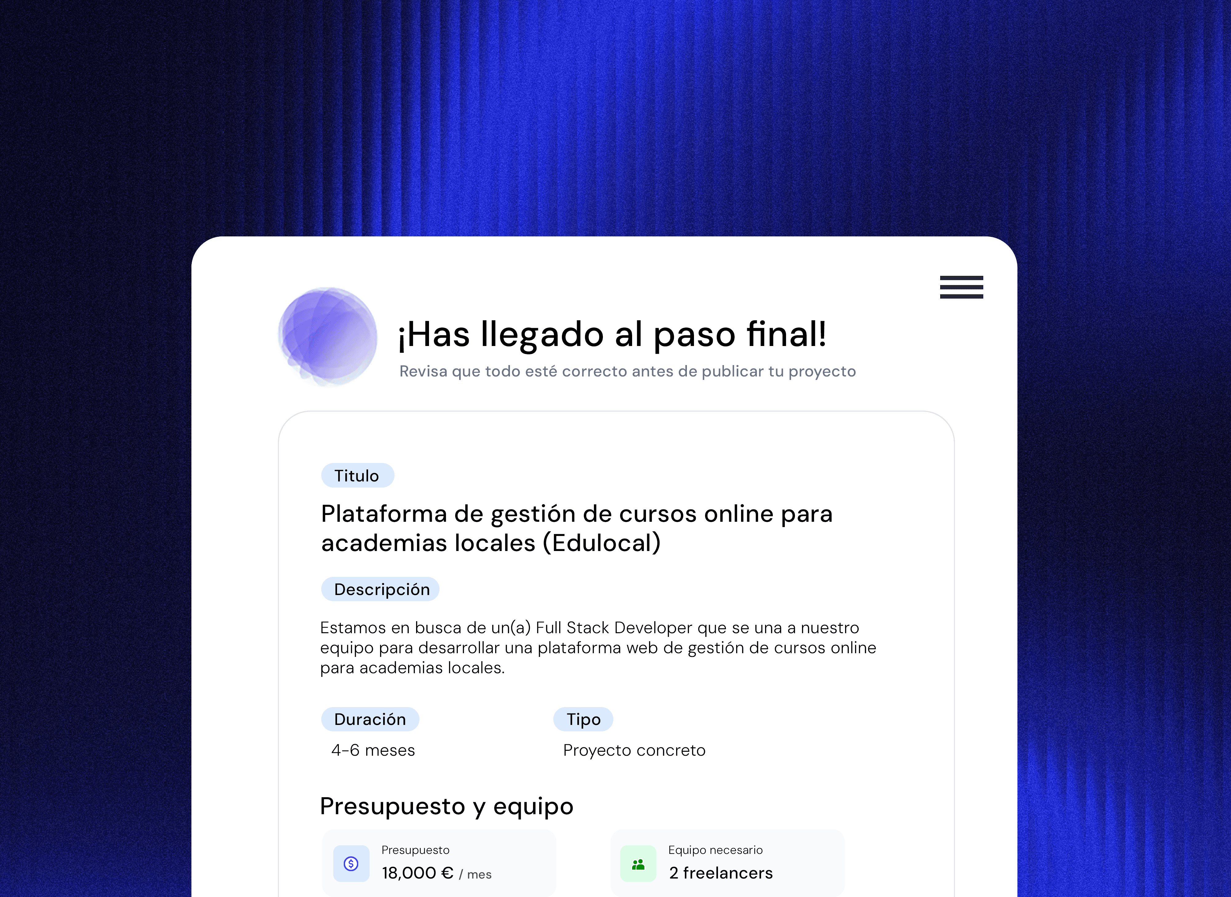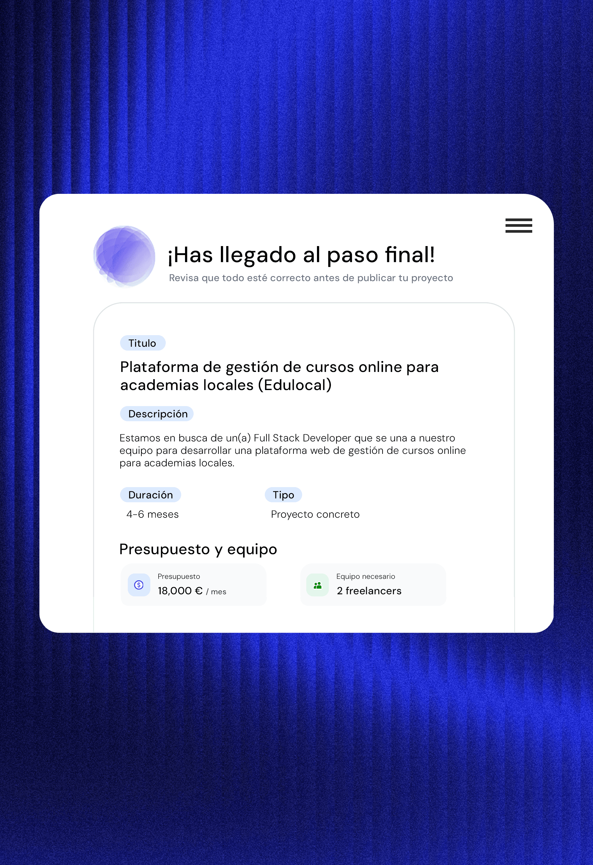 La mayoría de startups encuentran el perfil adecuado y cierran contratación en menos de 3 días desde la publicación del proyecto.