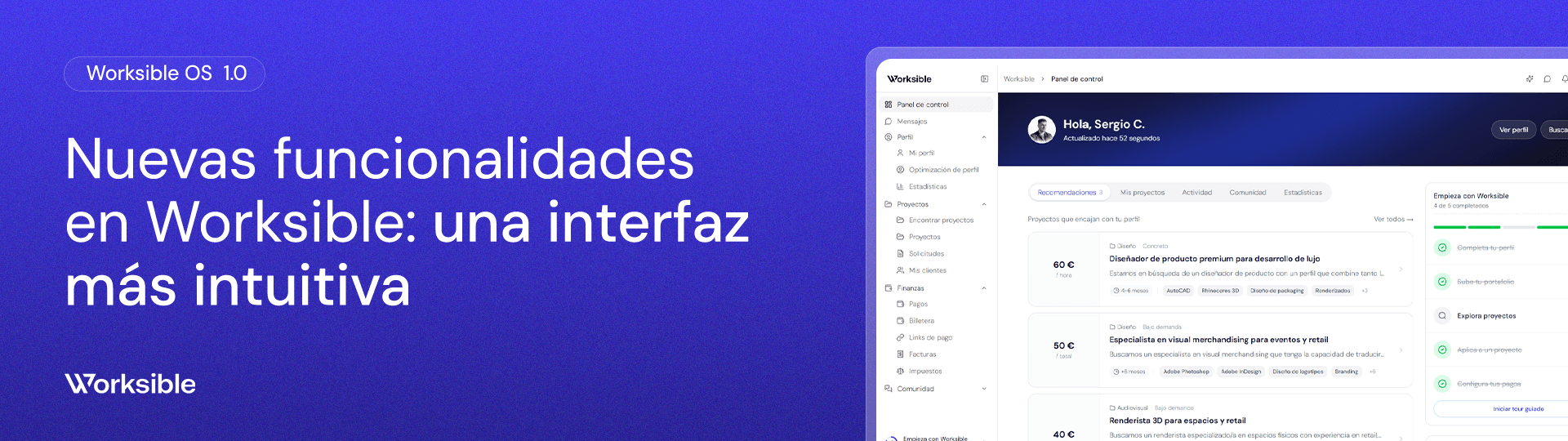 La nueva interfaz de Worksible transforma la experiencia dentro de la plataforma. Hemos simplificado la navegación, mejorado el rendimiento e integrado WorkAI para que freelancers y empresas trabajen de forma más eficiente desde el primer clic.